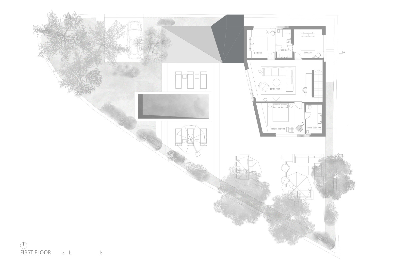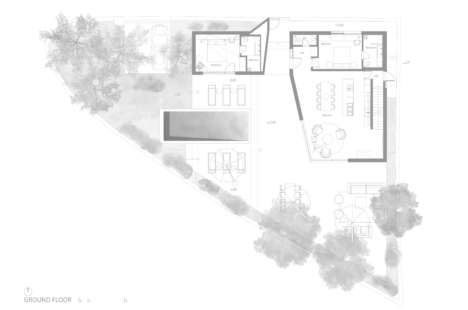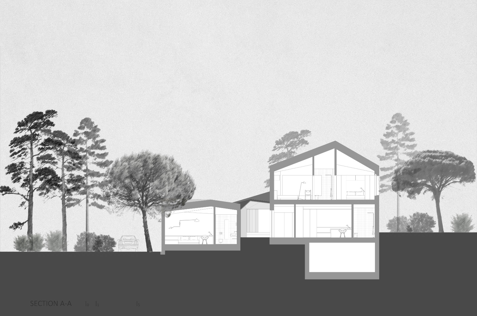 There are two buildings on the land parcel. One is a two-storey building – a family house, and the other is a ground-level building – a studio apartment. Both buildings express the need for a simple volume and avoid unnecessary enhancement of the overall design. They are realised as compact closed polyhedrons, strong volumes covered by the same material on all sides.