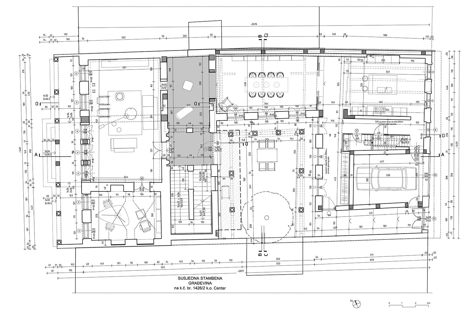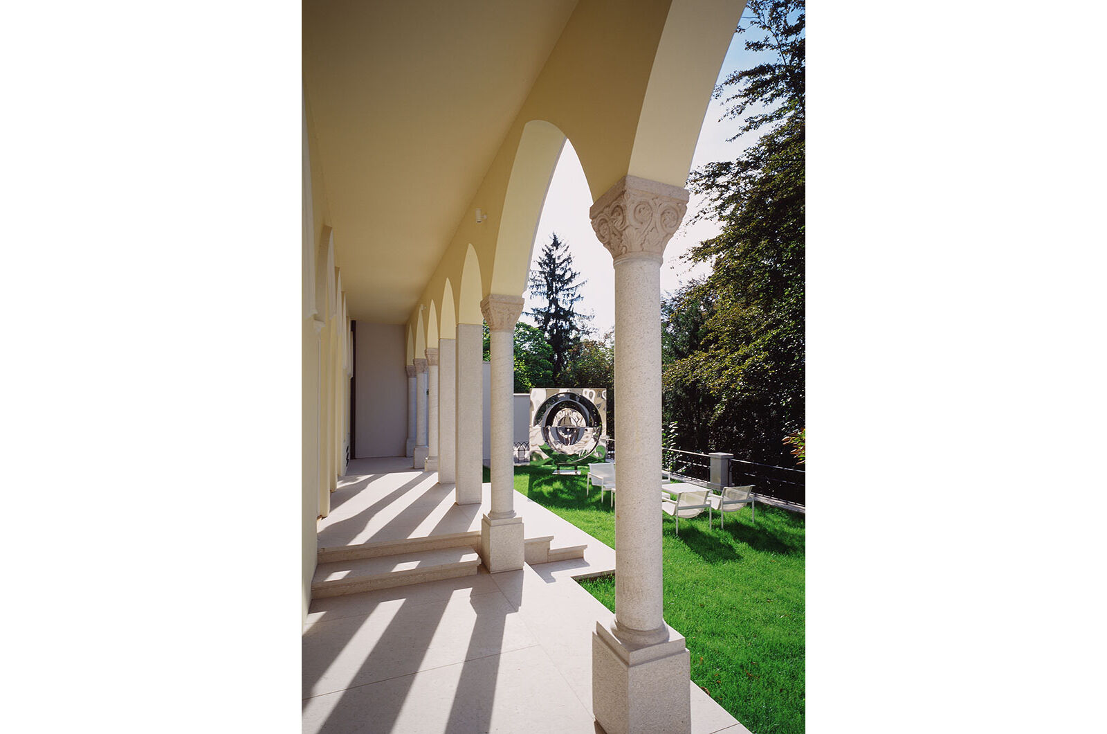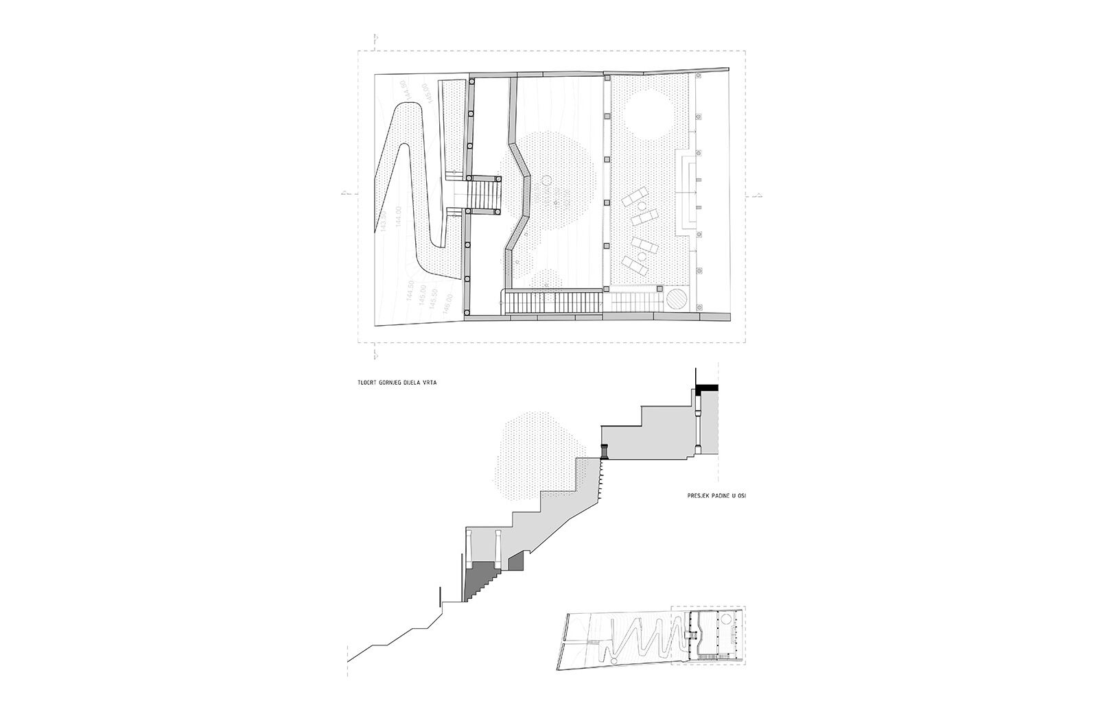 Osim stambenog dijela, okosnicu projekta čine tri točke okupljanja –preoblikovani središnji atrij sa suvremeno interpretiranim staklenim „ganjkom“, vertikalni dvoetažni prodor koji spaja dvije cjeline stambenog sklopa i predstavlja svojevrstan „unutarnji atrij“, te kaskadni vrt koji se stapa sa šumom. Prostor unutarnjeg atrija obilježen je dnevnim svjetlom koje prodire kroz veliku plohu ostakljenog dijela krova.Ovaj prostorni trokut dodatno estetski elaboriraju pomno odabrana umjetnička djela gorgonaškog kruga. U projektu je aktiviran i potpuno zapušten podrum, koji predstavlja i najstariji dio kuće –kulu iz fortifikacijskog sustava Gornjeg grada.