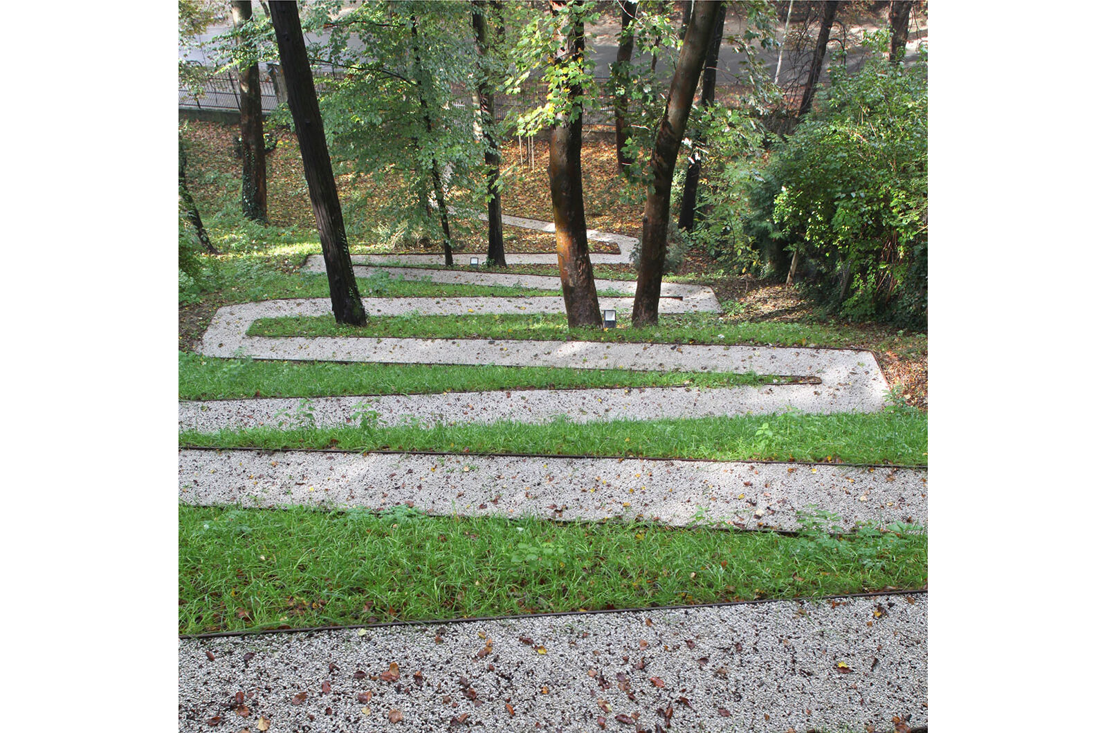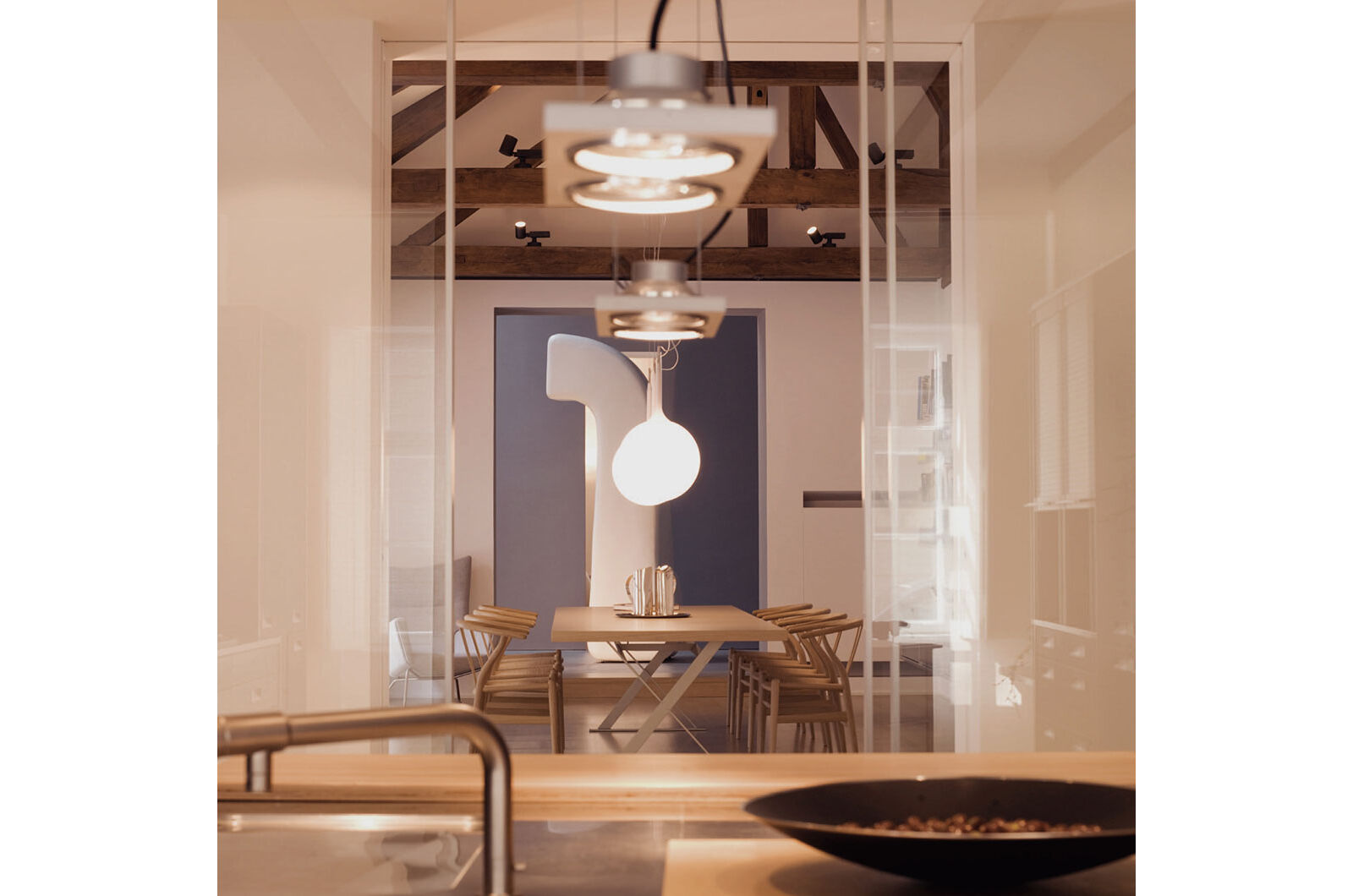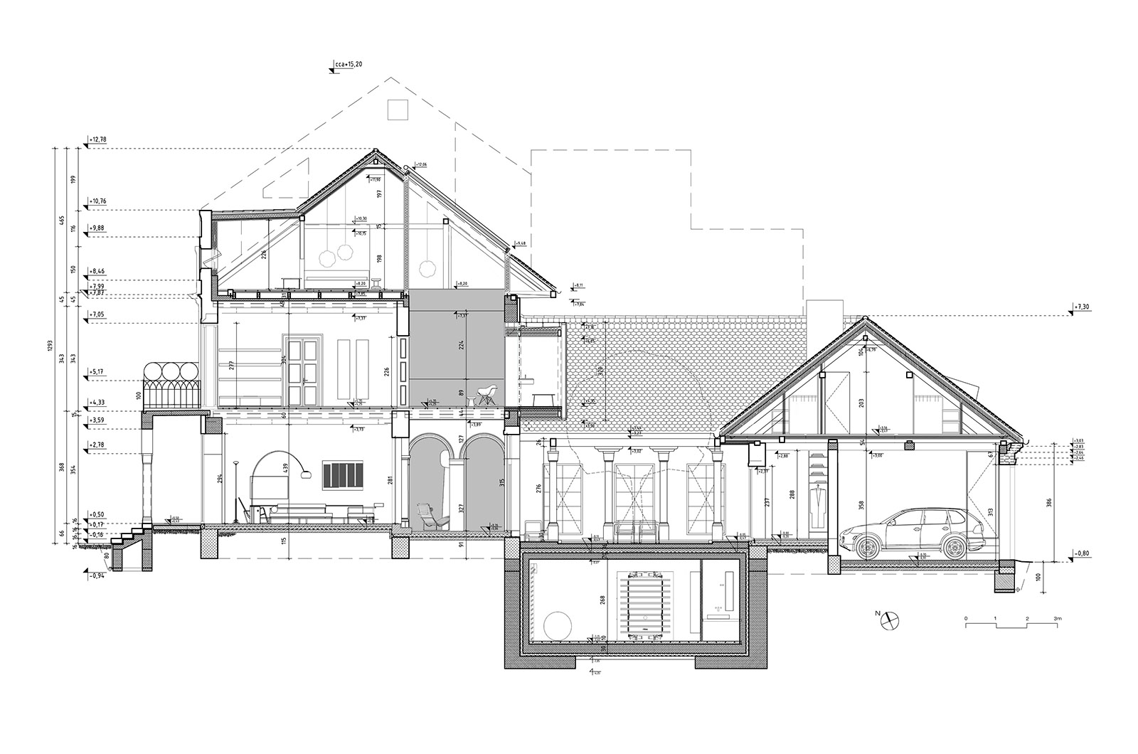 Osim stambenog dijela, okosnicu projekta čine tri točke okupljanja –preoblikovani središnji atrij sa suvremeno interpretiranim staklenim „ganjkom“, vertikalni dvoetažni prodor koji spaja dvije cjeline stambenog sklopa i predstavlja svojevrstan „unutarnji atrij“, te kaskadni vrt koji se stapa sa šumom. Prostor unutarnjeg atrija obilježen je dnevnim svjetlom koje prodire kroz veliku plohu ostakljenog dijela krova.Ovaj prostorni trokut dodatno estetski elaboriraju pomno odabrana umjetnička djela gorgonaškog kruga. U projektu je aktiviran i potpuno zapušten podrum, koji predstavlja i najstariji dio kuće –kulu iz fortifikacijskog sustava Gornjeg grada.